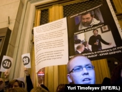 В Москве на Триумфальной площади прошла акция движения "Стратегия 31" в защиту 31-й статьи конституции, гарантирующей гражданам свободу собраний.
