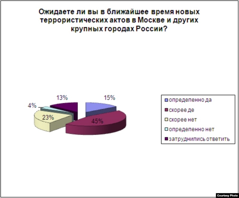 - Примерно от двух третей до 75% и даже до 80% взрослого российского населения не исключают, что их близкие могут в ближайшее время стать жертвами террористического акта. Все-таки из года в год подавляющее большинство россиян живет в зоне террористической угрозы. Естественно, это ощущение становится еще резче в тот период, когда такого рода теракты происходят, как было в марте прошлого года после взрывов в московском метро. Скорее всего, что-то такое будет и сейчас после событий в "Домодедово".