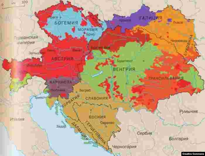 Андрей Шарый: Складывались по-разному, медленно и трудно, национальных конфликтов было много, трений и противоречий было много, но от провинции к провинции ситуация сильно отличалась. Наверное, главным национальным противоречием Австро-Венгрии было противоречие между монархической властью и венграми, прежде всего национально продвинутой частью венгерского дворянства. А со славянской стороны было по-разному – какие-то народы не имели сильных национальных амбиций, скажем, как словаки, которые до последних лет существования империи не отличались агрессивностью по отношению к Габсбургам. Было такое движение внутри Австро-Венгрии – австрославизм, движение за автономию славянских народов внутри империи. Проходили конгрессы славянских народов. Первый из них был созван в Праге в середине XIX века. На плакате этого конгресса красовались гербы всех славянских народов, которые себя таковыми считали, в составе Австрийской империи. Это десять щитов, и там есть такое, скажем, княжество, как Лодомерия (это Владимир-Волынский, русинские, как они назывались тогда, или ныне украинские территории).