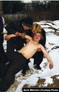 Юлия Кисина: Борис Михайлов, пожалуй, самый известный российский и украинский фотограф. Его работы находятся в крупнейших западных собраниях, в том числе в коллекции Саатчи в Лондоне. Живет Борис Михайлов в Берлине, на работу ездит в Харьков. Именно там он начал свою хронику советской жизни в конце 60-х и продолжает по сей день. Сейчас в Берлине в галерее Барбары Вайс проходит его выставка ''Чай, кофе, капучино'', представлены ''Черный архив'' конца 60-х и работы из Харькова последних лет. Выставка сделана как развернутая книга – смешное и горькое повествование о жизни великой державы. Михайлов платит своим моделям, выставляя их больные и изуродованные тела с татуировками и шрамами. Он использует их как испанский художник Сантьяго Сьерра, который нанял безработных, чтобы сделать татуировки, линии у них на спине, а потом заплатил черным, чтобы перекрасить их в блондинов. Как и Сантьяго Сьерра, Борис Михайлов – художник политический, его часто сравнивают с Нэн Голдин, которая бесстыдно документирует подноготную своих друзей и близких. Работы Михайлова безусловно беспардонны, то, что можно назвать ''жесть''. Они многих шокируют. Фотограф часто обвиняется в вуайеризме, в безнравственности и в других грехах. Серия ''История болезни'' 1997-98 годов, представленная в музее современного искусства в Нью-Йорке, включает почти 500 фотографий и рассказывает о харьковских бомжах.