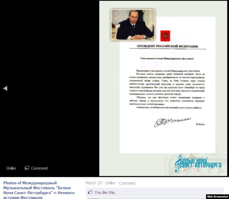 - Что такое "Международный фестиваль" Петербурга, который приветствовал Владимир Путин, будучи президентом? Организаторы "Белых ночей - 2011" говорят об этом факте в рамках "истории фестиваля".