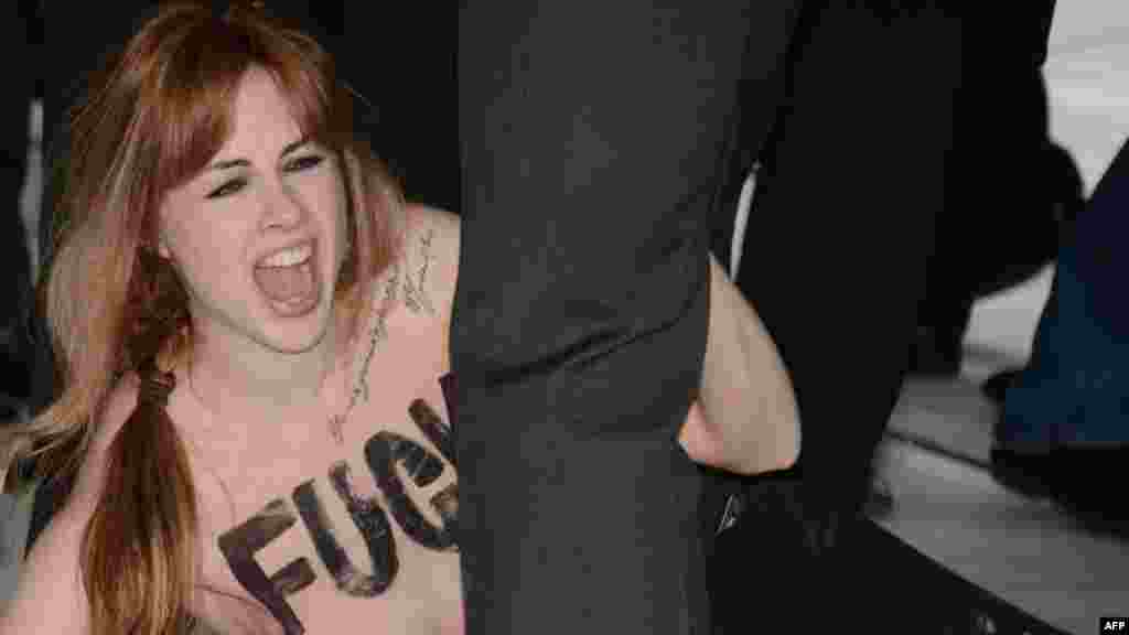 В тот момент, когда главы государств стояли у стенда компании Volkswagen, несколько девушек, которые находились среди журналистов, прорвались за ограждение, разделись по пояс и стали выкрикивать нецензурные лозунги на английском языке.