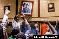 В Хараре ликующие люди снимают портрет многолетнего диктатора Зимбабве Роберта Мугабе, которого вынудили уйти в отставку военные. 21 ноября.