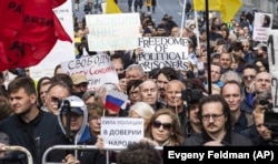 Участники митинга "За свободную Россию без репрессий и произвола", выступили за освобождение держащего голодовку в российской колонии украинского режиссера Олега Сенцова и других политзаключенных, в частности, антифа-активистов и сторонников Вячеслава Мальцева.