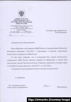 Как рассказала Ольга Литвиненко Радио Свобода, ответа на письмо от Владимира Путина, которого она знает с детства, не поступило, но пришло письмо из МИД РФ, подготовленное по поручению Администрации президента РФ. В этом письме сообщается, что загранпаспорт был выдан законно.