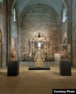 Александр Генис: Расположенный на севере Манхэттена филиал Метрополитена Клойстерс приютил третью часть выставки, где размещены современные вариации нарядов на католические темы среди еще более средневековых артефактов. Все это необычайно красиво. Но есть в этом зрелище некоторый привкус эпатажа. Характерно, что в главном зале постоянно крутят сцену из фильма Феллини "Рим", где, как вы помните, есть демонстрация мод в Ватикане, очень смешной и очень подходящий для выставки эпизод.