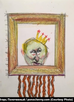 "Я не то чтобы являюсь поклонником Бэнкси, но история с его самоуничтожающейся картиной была на слуху. Поэтому я решил изобразить главного персонажа российской действительности в виде этой картины".