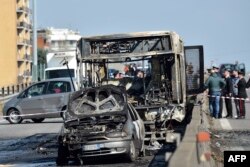 В Италии водитель автобуса с детьми протаранил на нём несколько полицейских машин, а затем поджёг его. Всего в этот момент в автобусе находились более 50 школьников. Некоторых из них преступник связал.