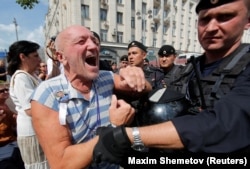 Прорвавшихся к мэрии протестующих начинает оттеснять цепь росгвардейцев, некоторых по одному вырывают из группы и уводят.