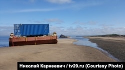 Утром 2 сентября информационное агентство "Беломорканал" опубликовало видео, снятое 31 августа рядом с двумя понтонами, оказавшимися у берега Двинского залива рядом с селом Нёнокса после взрыва на морском полигоне ВМФ. На видео показан замер радиационного фона, и его уровень рядом с понтонами существенно превышает допустимый. Сегодня Радио Свобода впервые публикует фотографии понтонов в высоком разрешении: на одном из них мы обнаружили подъемный кран, дизель-генератор, а главное – небольшой желтый контейнер для транспортировки опасных радиоактивных отходов.