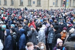 В Петербурге толпа людей идет по Невскому проспекту.