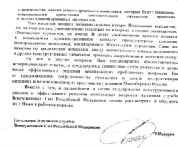Что касается вопроса мемориализации казарм Подольских курсантов, то, на наш взгляд, увековечению подлежат не казармы, а подвиг легендарных Подольских курсантов, их имена. В целях увековечения данного подвига в возводимом административном корпусе предусмотрено создание мемориального комплекса, посвященного Подольским курсантам. Сами же казармы, по заключению комиссии, ввиду значительного износа фундамента и других конструктивных элементов, признаны аварийными и подлежат сносу.
