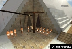 Реконструкция внутреннего пандуса, по которому внутри пирамиды поднимали каменные блоки. На открытых угловых площадках блок менял направление подъема.