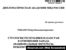 В интернете можно найти диссертацию Тимура Токаева, которую он защитил в академии МИДа в 2009 году: "Стратегия республики Казахстан в отношении Запада. Национальные интересы, приоритеты, направления". Фамилия Назарбаева упоминается в ней 112 раз на 215 страницах. Путин встречается 1 раз, Обама – 6, Буш – 14 раз. "Россия – единственный союзник Казахстана", – пишет Токаев-младший.