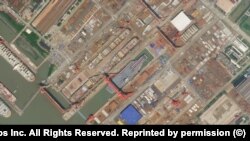17 июня Китайская государственная судостроительная корпорация спустила на воду третий национальный авианосец, получивший название "Фуцзянь" в честь восточной провинции страны. "Фуцзянь" называют "самым большим и могучим военным кораблем, когда-либо построенным азиатской страной". На этом снимке Planet.com он запечатлен 15 июня, за два дня до спуска на воду.
