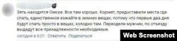 "Зять находится Омске. Все там хорошо. Кормят, предоставили места где спать, единственное езжайте в зимних вещах, потому что первые два дня будут спать просто в вещах, холодно там. Переодели мужчин, по отъезду выдадут все принадлежности необходимые", – пишет женщина из Красноярска (орфография и пунктуация оригинала).
